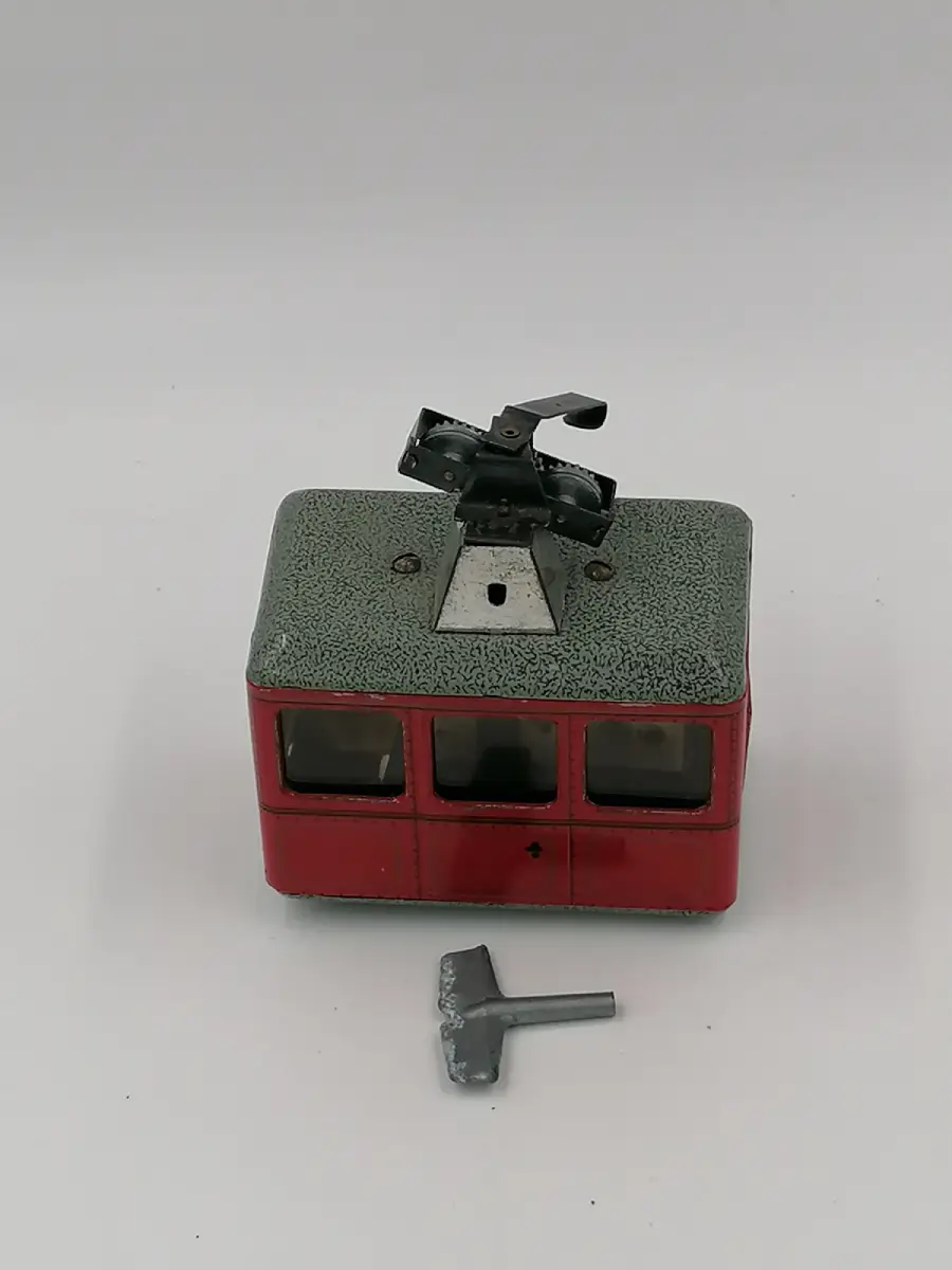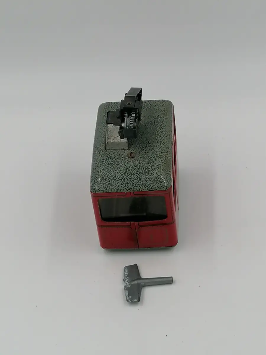 Jouet vintage cabine téléphérique en tôle avec clé pour remonter le mécanisme. Le mécanisme fonctionne.